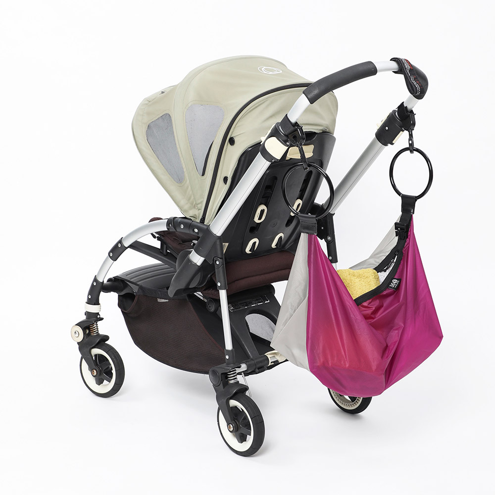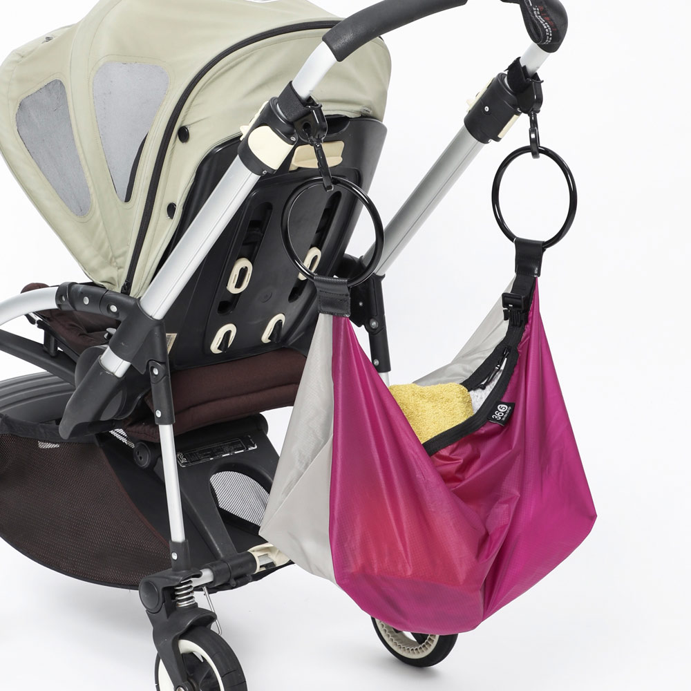 両サイドのハンドルをベビーカーなどのフックに掛ければ大容量ポケットに! かさばる荷物もスマートに収納。